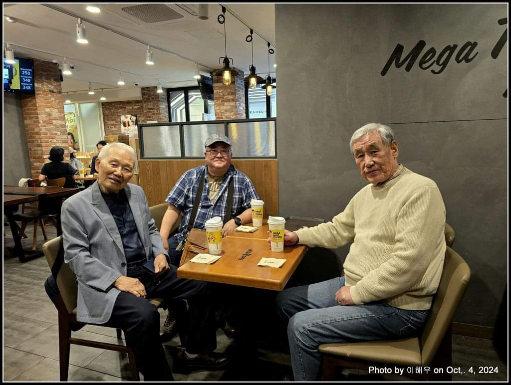 식당에서 근처의 메가 커피숍에 갔습니다. 뜨거운 커피를 앞에 놓고 세 사람은 거의 2 시간 동안 많은 이야기를 나누었습니다. 마치 LA에서의 반지회 모임처럼 말입니다. 주제는 사회, 경제, 정치, 삶과 문학에 이르기까지 다양하였지요. 정순영 형님은 이번에 새로 출간된 4인 시집 '금강산 가는 길'(조병기, 허형만, 임병호, 정순영)을 사인을 하여 선물로 주셨습니다.