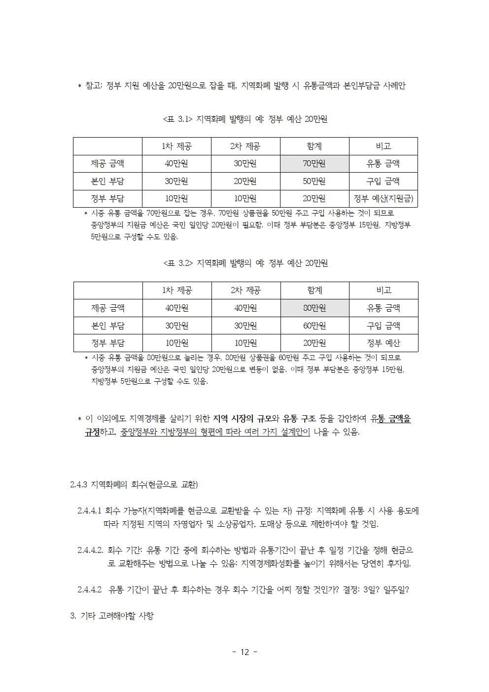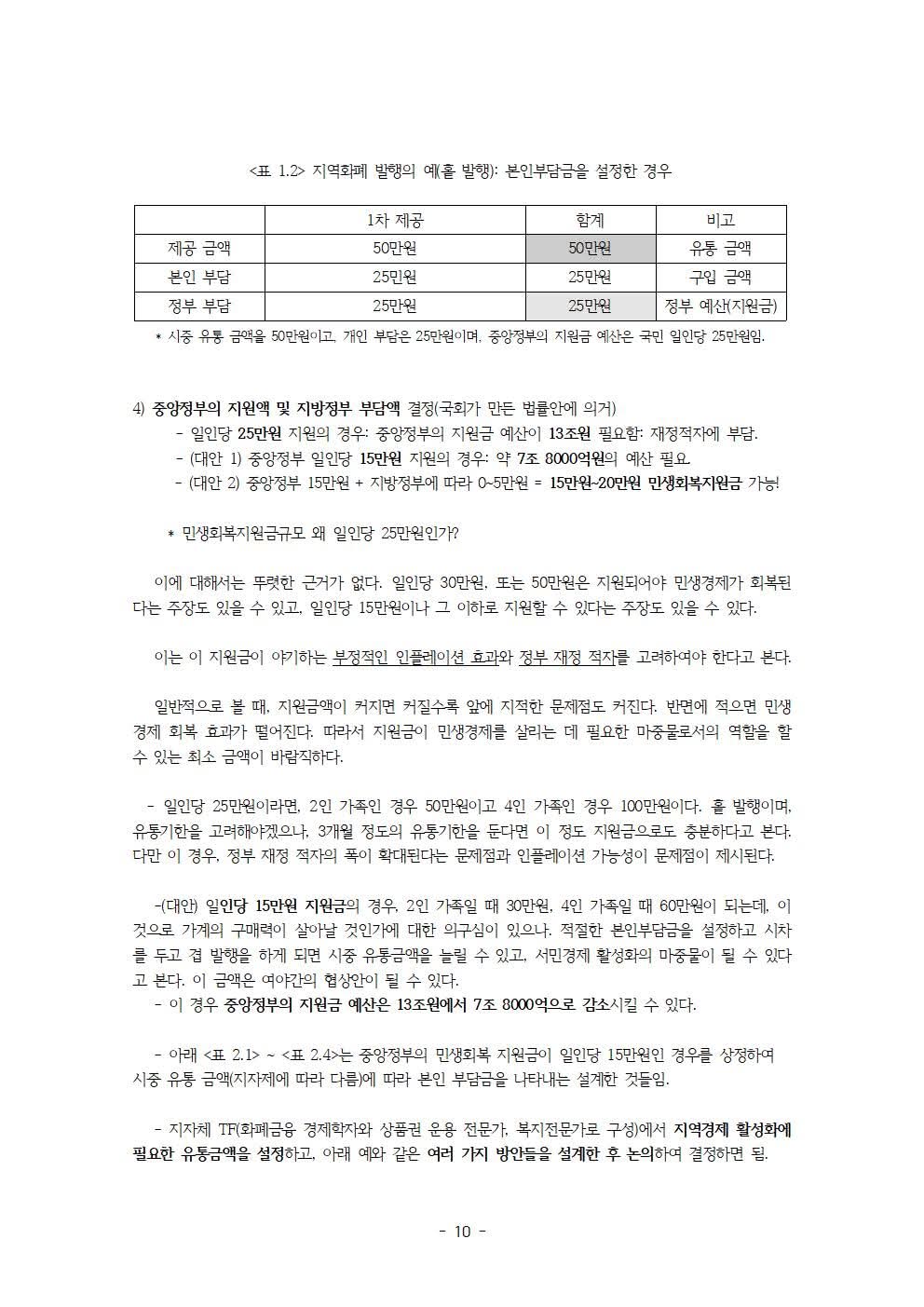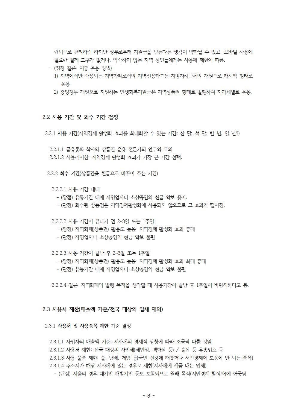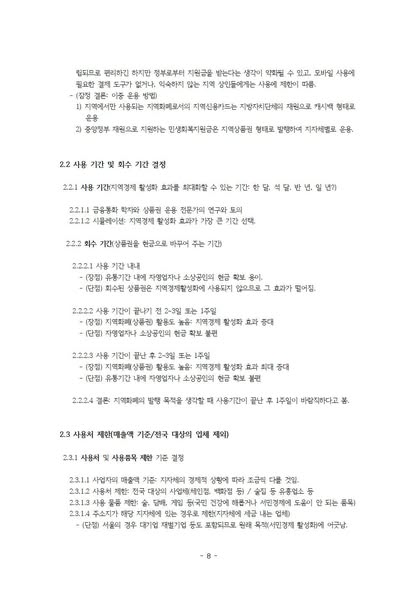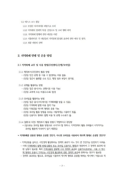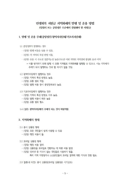 정부 부채 증가 문제에 대한 해결 방안으로서 다음과 같은 것들을 제안하고 있습니다. 예컨대, 지역화폐 발행 방법 (중앙과 지방 그리고 시민의 참여-본인부담금) 및 지역화폐의 용도 제한(사용처 및 사용 품목 제한), 정책 시행 시 중앙정부와 지방정부에서 해야 할 일 등입니다.