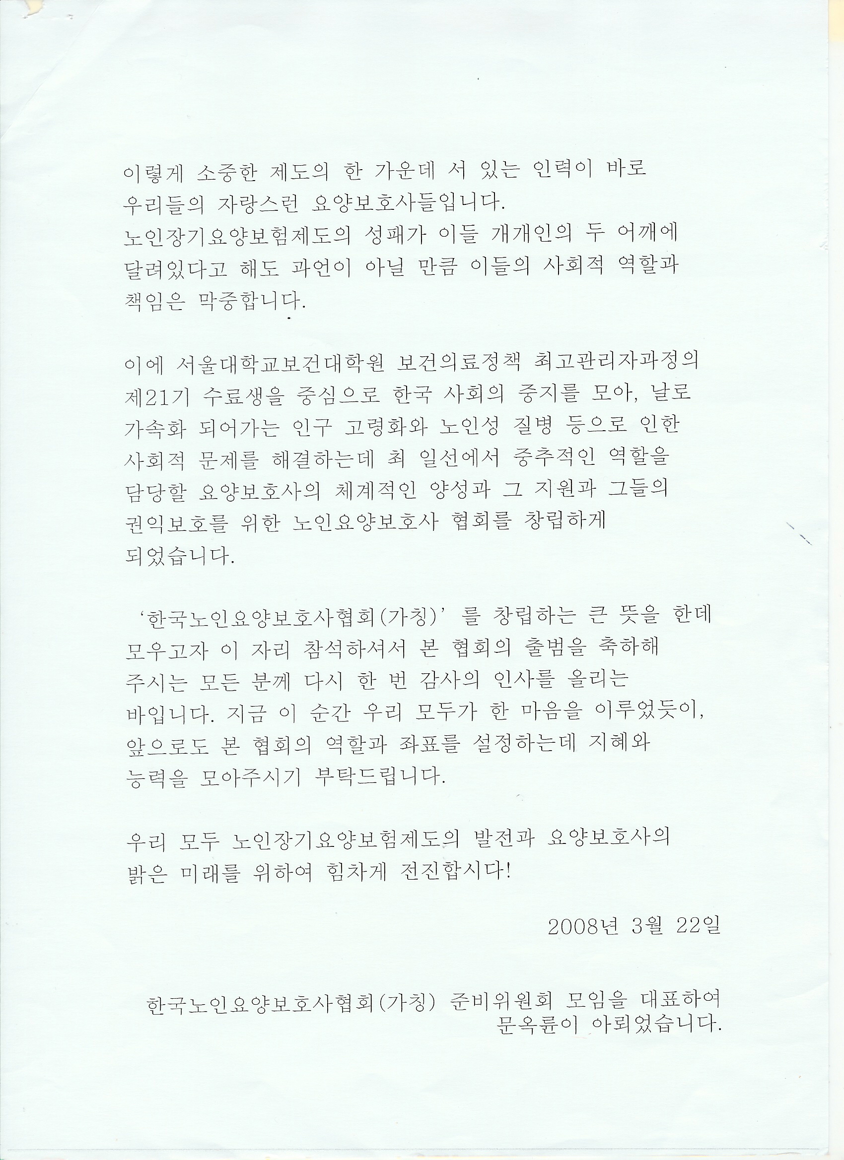 한국노인요양보호협회 2008년 3 월22 일 서울대보건대학원 강당에서 창립. 정관 등 통과 및 총회에서 회장,감사 선출