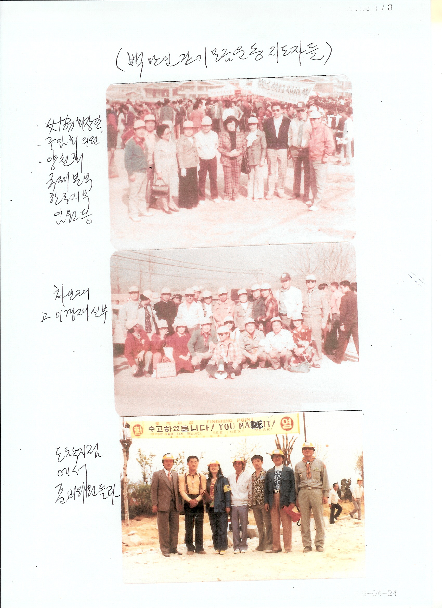 사진 1은 1978년 걷기운동 준비위원 연찬회-다락원 사진 2 는 제1회 걷기운동(1973년)명예대회장 미 8군 부사령관 피어스 중장 사진 3 은 출발지점에 나온 박근혜 영접과 출발지점사전답사시 피어스 중장 에게 상황설명하는 모습 등 사진 4 는 미국 상공회의소 간부와 걷기운동 참가 기념 촬영, 걷기운동 준비위원들과 도착지점에서 기념촬영 사진 5 는 걷기운동 출발지점 사진 사진 6은 걷기운동 지도자들 ** 이들 사진에서 자기사진이 있는 분은 연락바랍니다 Are you in any of these pictures? Please contact Professor Kwon,former walk coordinator( Chairman of the steering committee for Walk, 1973 ~ 1979 ). M 011-719-4540 |