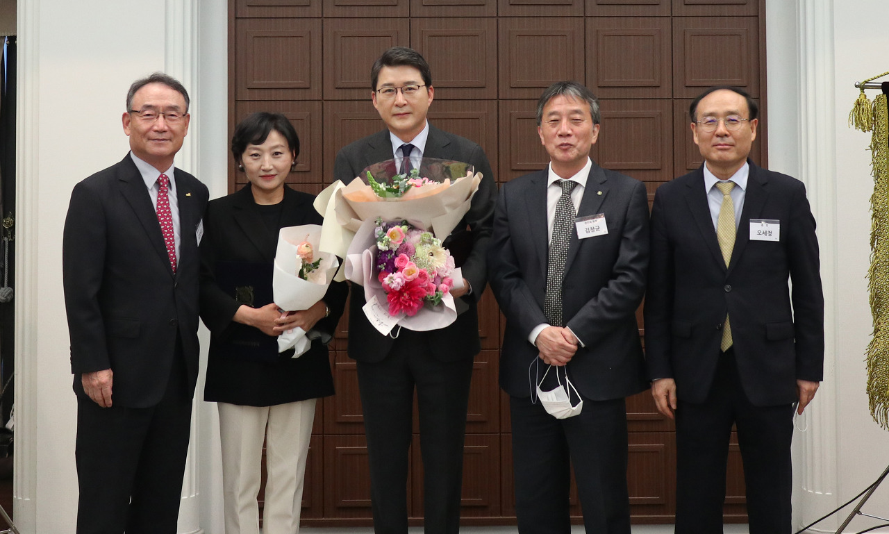 4월 28일 한국프레스센터 내셔널프레스클럽에서 열린 관악언론인회 정기총회에서 신동욱 TV조선 보도본부장이 제18회 서울대 언론인 대상을 수상했다. 왼쪽부터 김인규 본회 상임부회장, 수상자 부인 신재은씨, 수상자 신동욱 동문, 김창균 관악언론인회 회장, 오세정 모교 총장.