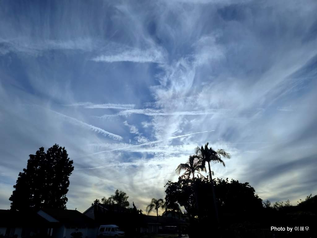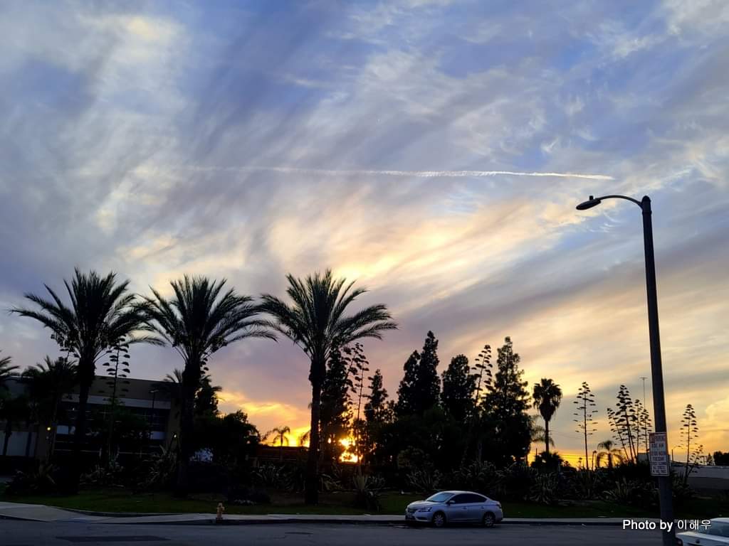 돌아오다 딸 주려고 한국에서 온 '교촌 치킨' 가게에 들러 치킨을 주문하였는데, 이 집은 그때그때 튀기는지 20분이나 기다려야 했습니다. 석양이 붉은 저녁이었는데 밖에 서성이며 기다리다 하늘을 보니 나 보라고 자랑하려고 작정을 하였는지 역시 예뻤습니다.