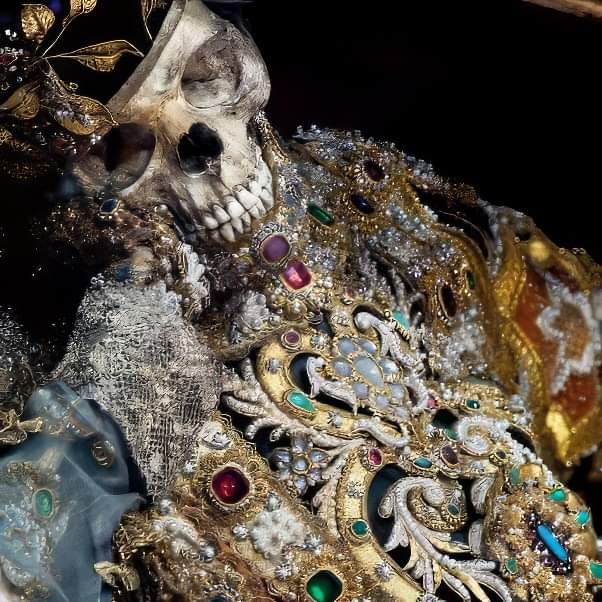 "카타콤의 성자들"로 알려진 이 해골들은 발굴 후 다시 조심스럽게 조립되었는데, 이들은 놀랍게도 아름답고 환상적인 의상과 가발, 왕관, 보석, 그리고 갑옷을 입은 부유한 모습이었습니다. 이것은 사후에 이런 천상의 보물들이 당신들을 기다린다는 것을 신도들에게 상기시켜주는 것이라는 의미라더군요. 하지만 현재의 대중적 입장에서 보면 값을 매길 수 없는 보물들로 덮인 이 시체들은 정말로 섬뜩하다 하지 않을 수 없습니다.